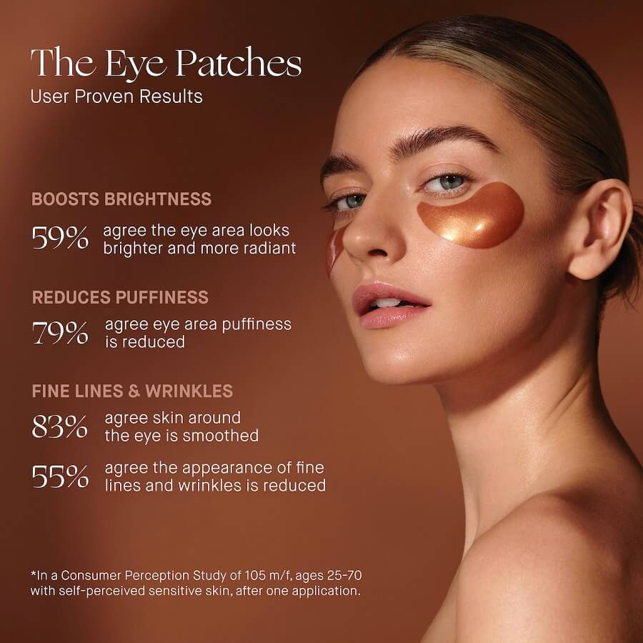Revitalizirajući hidrogel patchevi za oči, koji hidratiziraju, posvjetljuju i zaglađuju, a istovremeno smanjuju pojavu podočnjaka, natečenosti, sitnih linija te bora. Utemeljeni su na TFC8® tehnologiji i formuliran s hidratantnom acetiliranom hijaluronskom kiselinom, ekstraktom korijena suncokreta, koji daje punoću i posvjetljujućim niacinamidom. Acetilirana hijaluronska kiselina prodire dvostruko dublje u kožu od konvencionalne hijaluronske kiseline za vrhunsko zadržavanje vlage. Niacinamid je višenamjenski vitamin, koji pomaže umiriti kožu, smanjiti crvenilo, sitne linije i bore te povećati sjaj. Fermentirani polisaharidi jačaju barijeru kože sprječavajući transepidermalni gubitak vode. Alantoin je prirodni spoj koji omekšava i umiruje kožu, istovremeno ublažavajući suhoću, crvenilo, iritaciju i osjetljivost, dok nudi nježan piling za povećanje blistavosti. Ekstrakt zelenog čaja sadrži antioksidanse i kofein, koji pomažu ublažiti natečenost i umiruju kožu. Vitamin B5 je superheroj kože, dubinski kondicionira, privlači i zadržava vlagu te podiže ten za osvježenu, blistavu kožu. Vitamin E snažno obnavlja kožu i podržava funkciju barijere dok štiti osjetljivo područje oko očiju od stresnih faktora i ciljano djeluje na znakove preranog starenja.