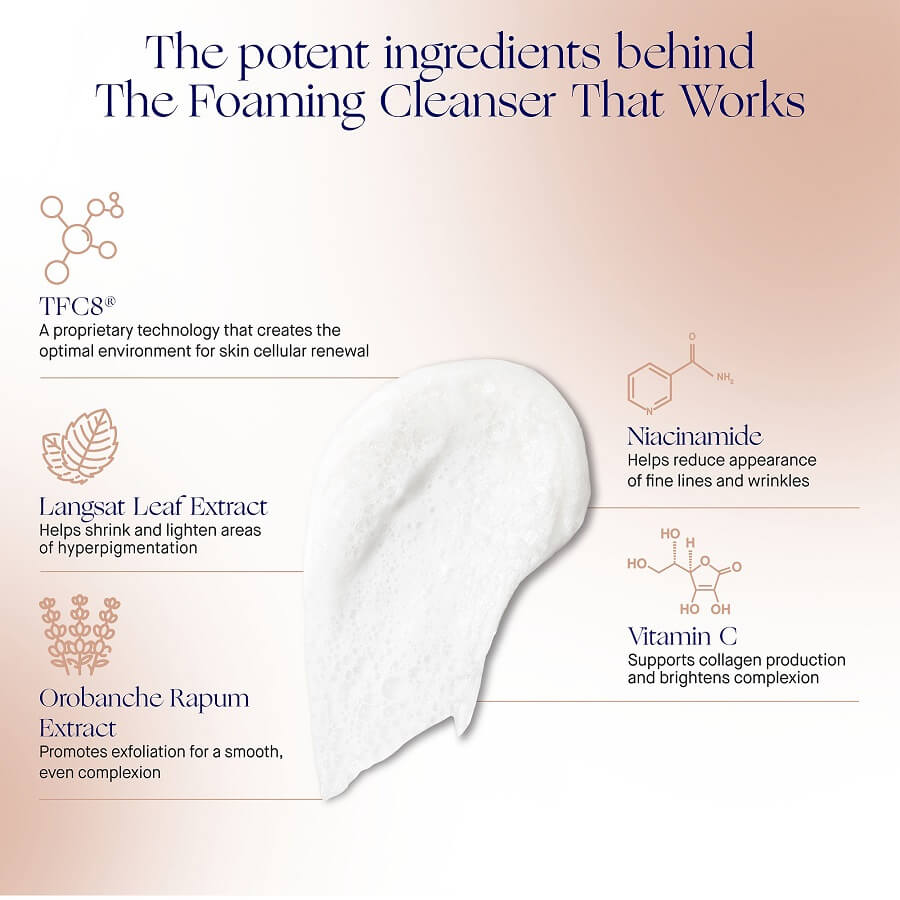 Pročišćavajuće dnevno sredstvo za čišćenje koje nježno uklanja nečistoće, šminku i višak masnoće dok vraća vlažnost, umiruje kožu i posvjetljuje vaš ten. Pokretan TFC8® tehnologijom i formuliran s čistim superhidratantima i moćnim biljnim sastojcima, uključujući večernji ekstrakt lista langsat i obnavljajući ekstrakt Orobanche Rapum. Ekstrakt Lista Langsata vijetnamski je ekstrakt bogat hranjivim tvarima; ovaj moćni antioksidans pomaže smanjiti i posvijetliti područja hiperpigmentacije izazvane stresorima iz okoliša za blistavu, ujednačenu kožu. Ekstrakt Orobanche Rapum ova obnavljajuća aktivna supstanca pomaže ubrzati prirodni ciklus obnove kože, potičući piling dok uravnotežuje mikrofloru kože i jača kožnu barijeru. Niacinamid je višenamjenski vitamin koji pomaže umiriti kožu, smanjiti crvenilo, pore, sitne linije i bore te pojačati sjaj. Ulje Moringe bogato je oleinskom kiselinom, poznatom po intenzivno hidratizirajućim, antimikrobnim i protuupalnim svojstvima, a bori se i protiv znakova starenja za blistavu, čistu i ujednačenu kožu. Ekstrakt drveta Quillaja Saponaria bogat je saponinima i pomaže ukloniti višak masnoće dok sprječava gubitak vode, ostavljajući kožu čistom, mekom i obnovljenom.