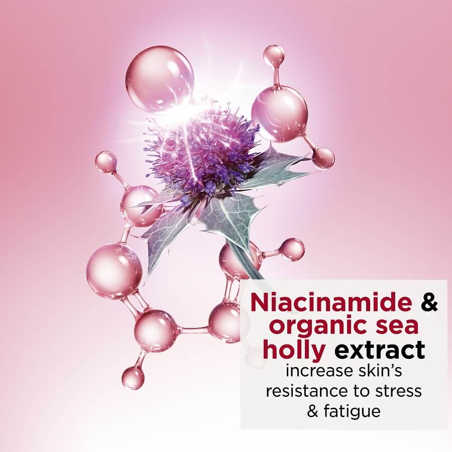 Koža je posebno izložena stresu tijekom dana, stoga je noć najbolje vrijeme za poticanje njezine obnove. Ova bogata, obnavljajuća krema s 94% prirodnih sastojaka sadrži inovativnu tehnologiju: [Skin Charger Complex]: niacinamid, u kombinaciji s ekstraktom primorskog čička, čini snažan duo koji pomaže smanjiti prve vidljive znakove starenja. Jača se barijera kože, pojačava njezin sjaj i čuva mladost.