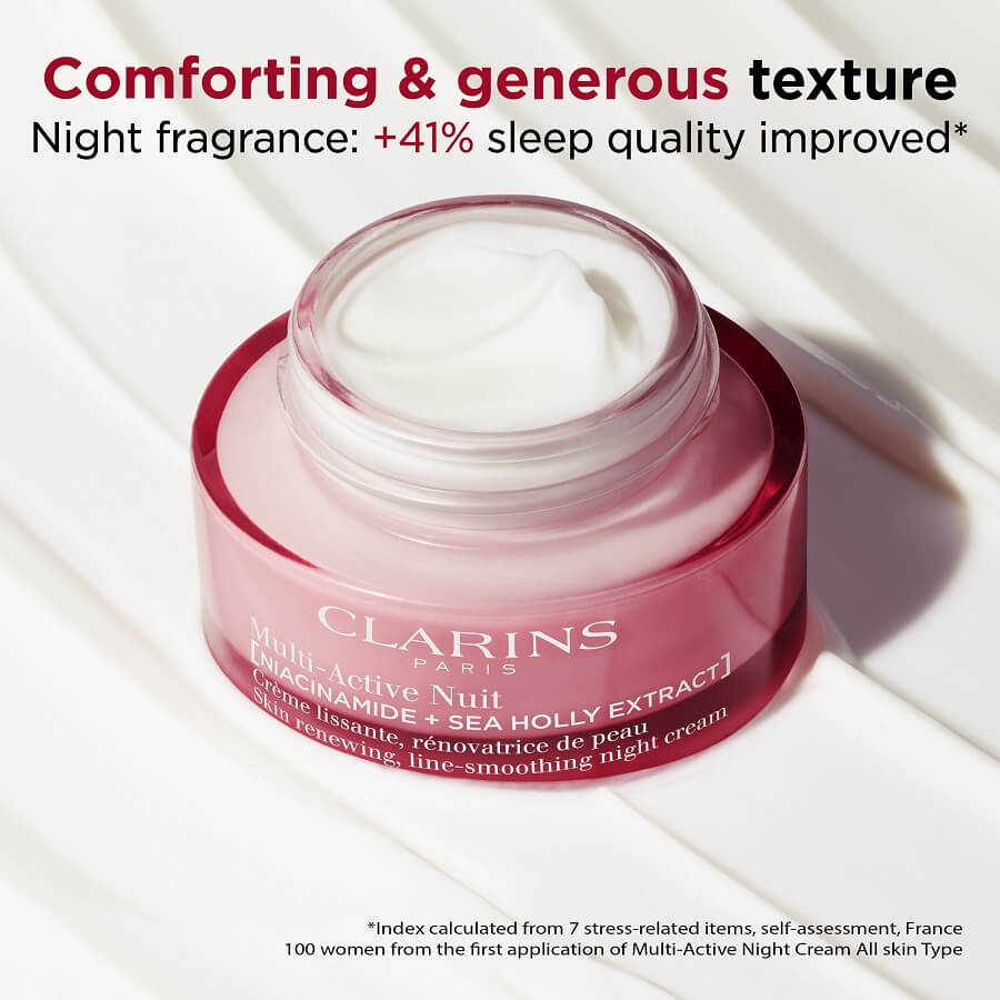 https://www.douglas.hr/p/clarins-multi-active-night-cream-dry-skin-cla177668?c=8711CLA177668Multi-Active Night Cream Dry Skinhttps://media.douglas.hr/media/image/88/ee/52/3666057177668.jpg80.8980.89EURInStockLice/Njega lica/Kreme za lice<p>Koža je posebno izložena stresu tijekom dana, stoga je noć najbolje vrijeme za poticanje njezine obnove. Ova bogata, obnavljajuća krema s 94% prirodnih sastojaka sadrži inovativnu tehnologiju:<br> [Skin Charger Complex]: niacinamid, u kombinaciji s ekstraktom primorskog čička, čini snažan duo koji pomaže smanjiti prve vidljive znakove starenja. Jača se barijera kože, pojačava njezin sjaj i čuva mladost.<br><br> Snažan tetrapeptid pomaže koži da se obnovi tijekom noći.<br> Kakaov maslac omekšava kožu.<br> Rezultat: koža izgleda odmorno, glatko, hidratizirano, blistavo kada se probudite.</p>ClarinsEUR00https://media.douglas.hr/media/image/72/c1/8c/3666057177668_1.jpghttps://media.douglas.hr/media/image/5b/ec/6d/3666057177668_2.jpghttps://media.douglas.hr/media/image/00/ce/dd/3666057177668_3.jpghttps://media.douglas.hr/media/image/c3/d5/d5/3666057177668_4.jpghttps://media.douglas.hr/media/image/14/f1/eb/3666057177668_5.jpghttps://media.douglas.hr/media/image/36/75/5e/3666057177668_6.jpgadd-to-cart1617.80 EUR * /1 l50,ml50ml000Krema za njegu licaKreme za lice