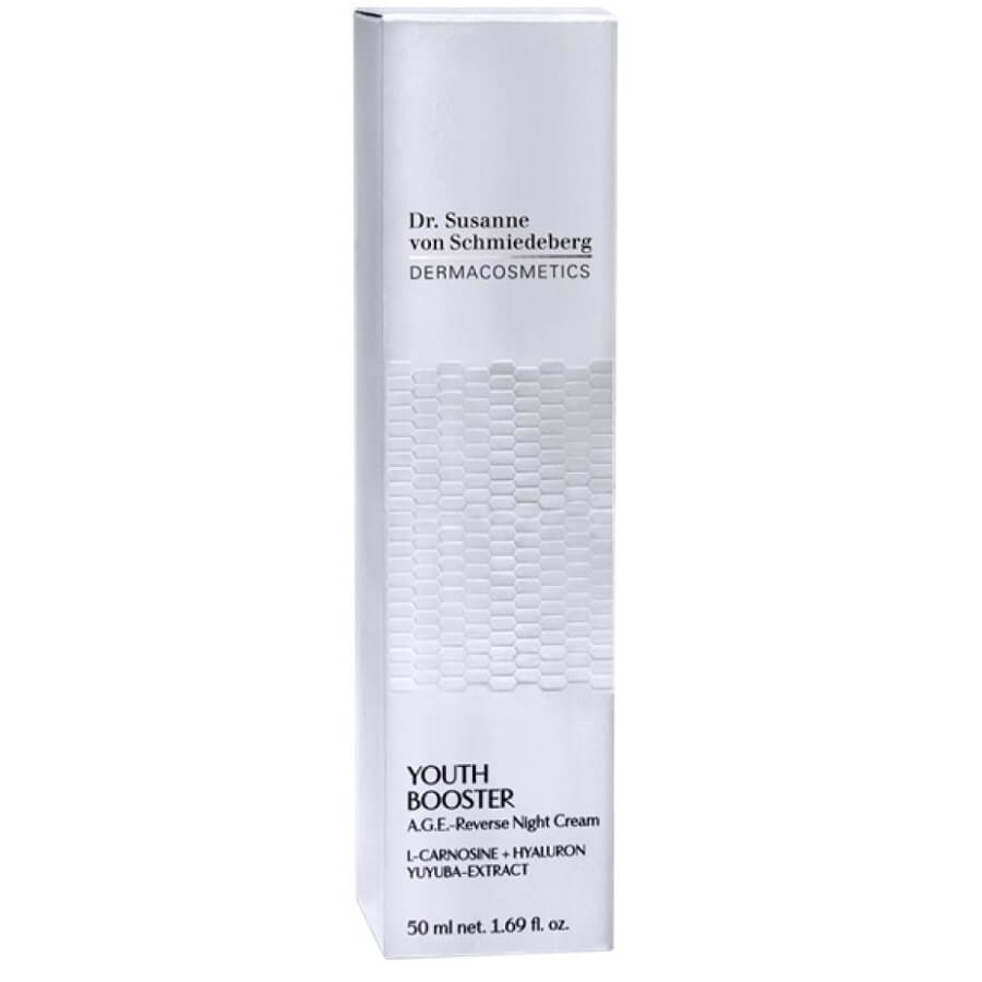 Noćna krema Youth Booster A.G.E. Reverse od Dr. Susanne von Schmiedeberg ima dvostruki i učinkovit učinak protiv starenja kože usporavajući saharifikaciju stanica i već ukrućenim kolagenim vlaknima pruža veću elastičnost. Jedinstveni aktivni sastojak L-Carnosine može smanjiti A.G.E.s (Advanced Glycation Endproducts), koji su odgovorni za saharifikaciju kože, i tako usporiti proces starenja kože. U isto vrijeme, inovativni ekstrakt Yuyube može vratiti elastičnost već saharificiranih kolagenih vlakana podržavajući razgradnju postojećih A.G.E.s. Vidljivi rezultat: mladolika, blistava, glađa koža ujutro. Pogodno za sve tipove kože.