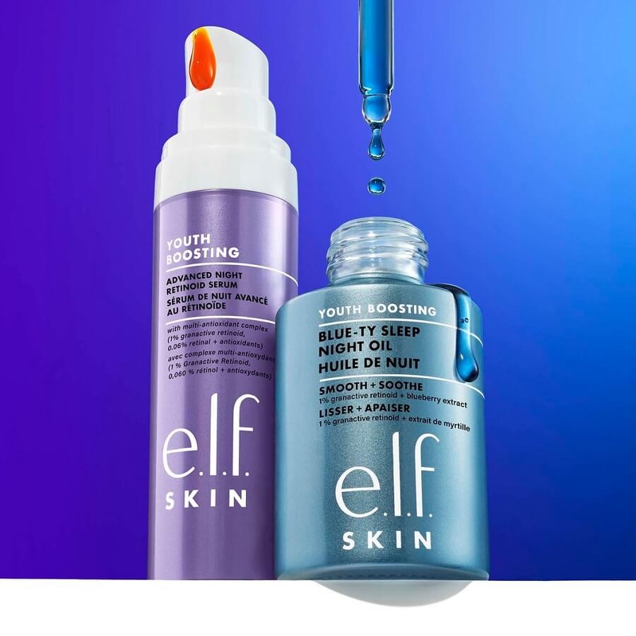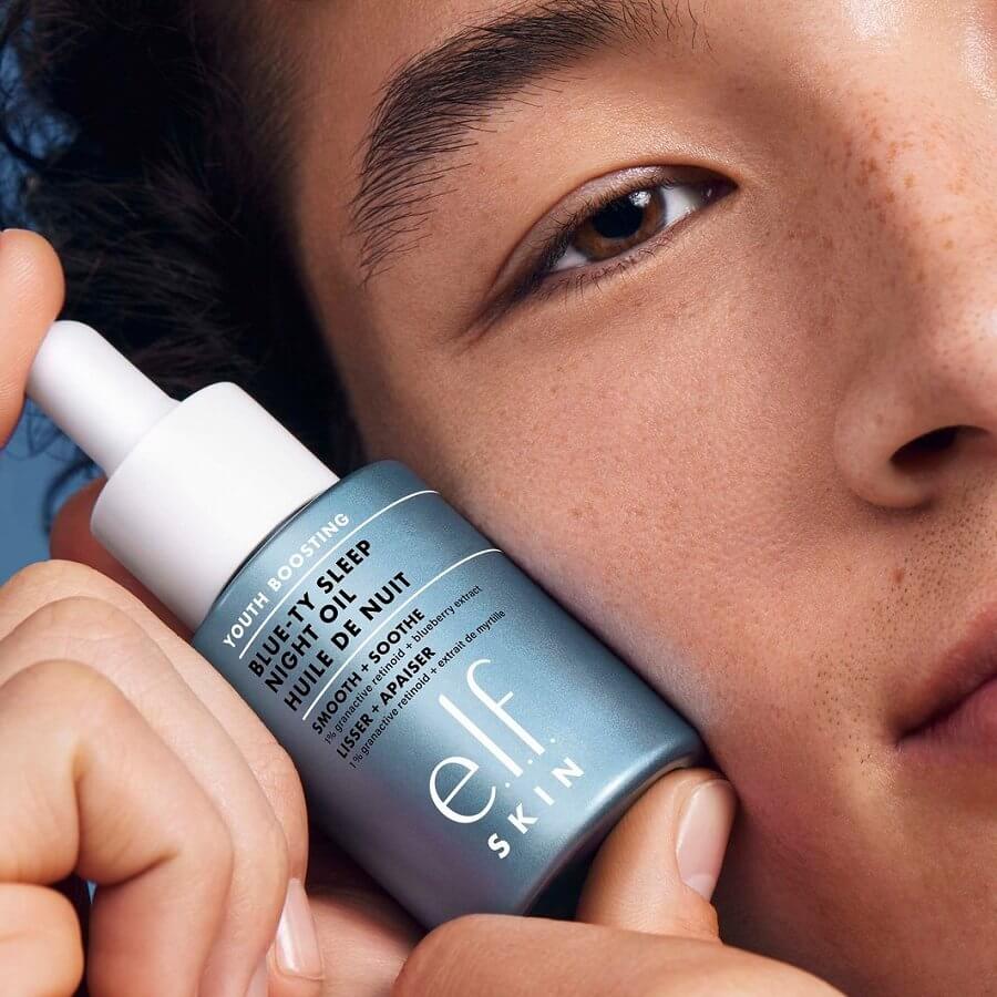 e.l.f. SKIN Youth Boosting Blue-ty Sleep Night Oil je nježno, ali učinkovito ulje za lice s 1% granactive retinoida za smanjenje izgleda sitnih bora, nejednakosti, suhoće i umora tijekom vremena. Sadrži ekstrakt borovnice i ulje boražine. Hranjiva, brzo upijajuća formula djeluje dok spavate. Ovo ulje za lice nije komedogeno, sigurno za osjetljivu kožu i ima plavu boju koja nestaje nakon stapanja s kožom.