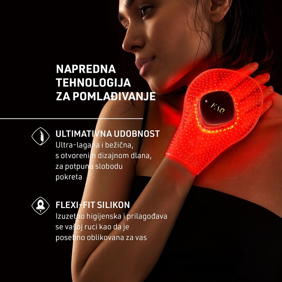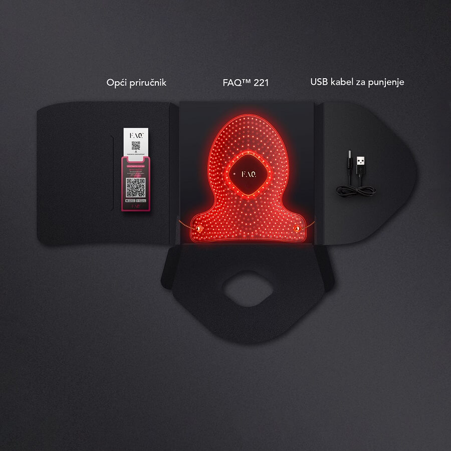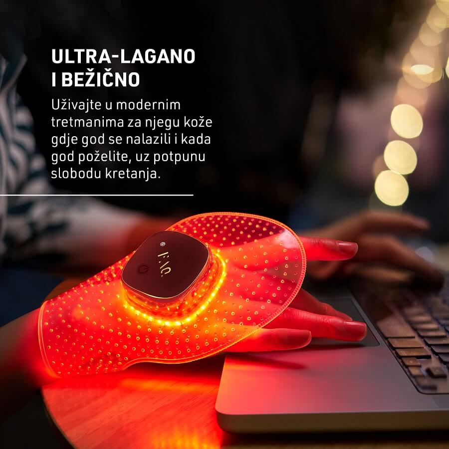 Napravljen od ultra-higijenskog i fleksibilnog silikona, FAQ™ 221 prilagođava se vašoj ruci, osiguravajući da svaki dio kože prima istu koncentraciju LED svjetla.
