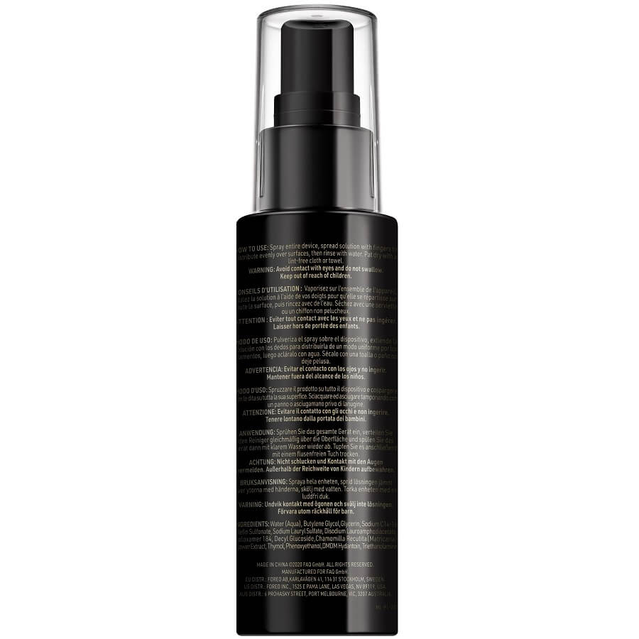Dizajniran za bezbrižno čišćenje dragocjenih FAQ™ silikonskih uređaja protiv starenja, FAQ™ silikonski sprej za čišćenje pojačava higijenski element vaše rutine njege kože. Čista i učinkovita formula, potpuno bez alkohola i parabena, ubija 99,9% bakterija i mikroba na silikonskim površinama FAQ™ uređaja, produžujući njihovu trajnost i poboljšavajući rezultate tretmana održavanjem standarda čistoće kliničkih postavki uz rezultate obnavljanja uređaja.