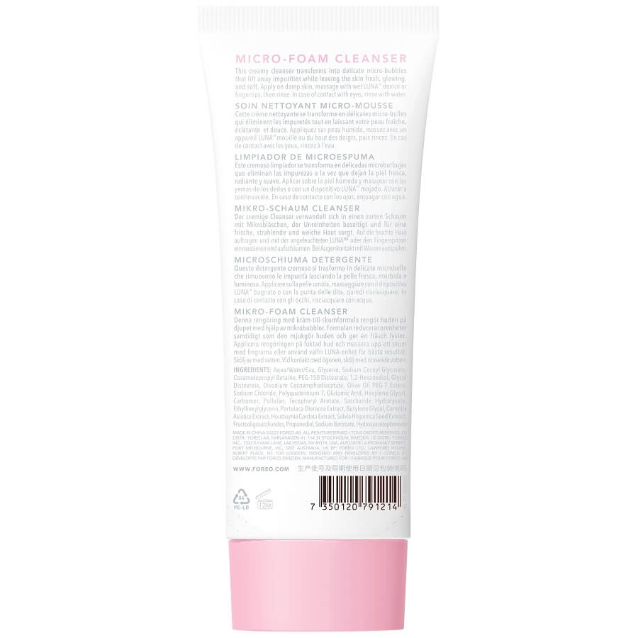 Satenasto i lagano sredstvo za čišćenje, aktivirano LUNA™ T-Sonic™ pulsacijama, dizajnirano je da odgovara svim tipovima kože, čak i onoj najosjetljivijoj i razmaženoj. Proizveden iz mudrosti prirodnog zdravlja kože, LUNA™ Micro-Foam Cleanser 2.0 formuliran je s 87% sastojaka prirodnog podrijetla. Uživajte u blagodatima hidratizirajućih i zaglađujućih aminokiselina, antioksidativnoj supermoći vitamina E, umirujućim vještinama vrhunske Cice (Centella Asiatica) kao i prebioticima koji balansiraju mikrobiom kože. Koristite svakodnevno i uživajte u svojoj koži.