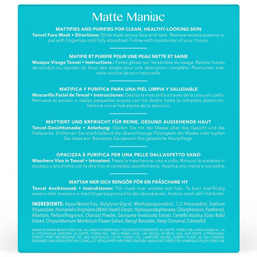 Matte Maniac 2.0 maska za lice pruža osjećaj svježine i pomaže umiriti te pročistiti kožu. Posebno je osmišljena za T-zonu, mješovitu, masnu i kožu sklonu nepravilnostima te je idealna za one koji žele pročistiti kožu i smanjiti vidljivost pora i nepravilnosti. Kombinacijom plave i crvene LED svjetlosti, zagrijavanja, hlađenja i dubokih T-Sonic™ pulsacija s formulom koja sadrži 89 % sastojaka prirodnog podrijetla poput ugljena, hamamelisa, cice, snježnog lotosa i krizanteme, tretman trenutačno umiruje, uravnotežuje i pomaže neutralizirati nečistoće za čišći i zdraviji izgled tena.