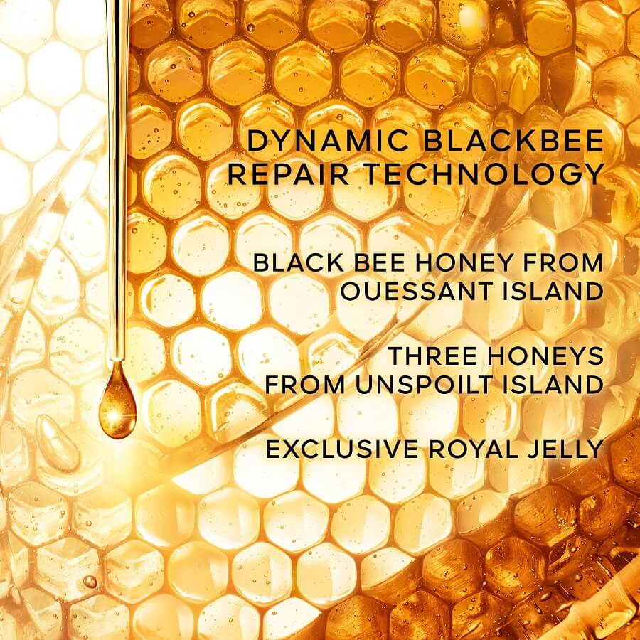 Pčele proizvode neke od najučinkovitijih prirodnih ljekovitih tvari na svijetu. Guerlain Research kontinuirano radi s medom i matičnom mliječi kako bi stvorio Abeille Royale: program za njegu kože s tehnologijom BlackBee Repair, koja pomaže stimulirati ključne mehanizme procesa samooporavka kože¹ kako bi se kontinuirano korigirale bore i gubitak čvrstoće tkiva. ¹In vitro test na sastojku.