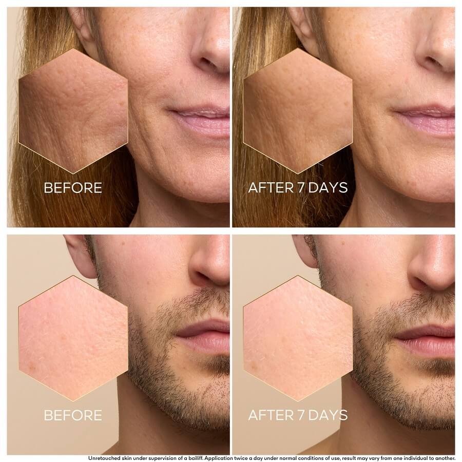 ¹U epidermisu. ²Instrumentalni test, mjerenje dužine bora, 31 žena, nakon 1 nanošenja. ³Instrumentalni test, 40 žena, nakon 1 aplikacije. ⁴Test samobodovanja, 40 panelista, 2 aplikacije dnevno.