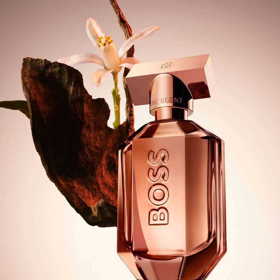 BOSS The Scent Parfum for Her ponovno ističe osnažujuću senzualnost u upečatljivoj bočici ukrašenoj ogromnim BOSS logom na svjetlosmeđe lakiranom staklu i čepom od ružičastog zlata s monogramom Double-B. Hvatajući svjetla reflektora, njegov višestrani oblik odražava osjetilni obračun unutar ovog provokativnog mirisa, istovremeno odražavajući mnoge strane moćnog para.