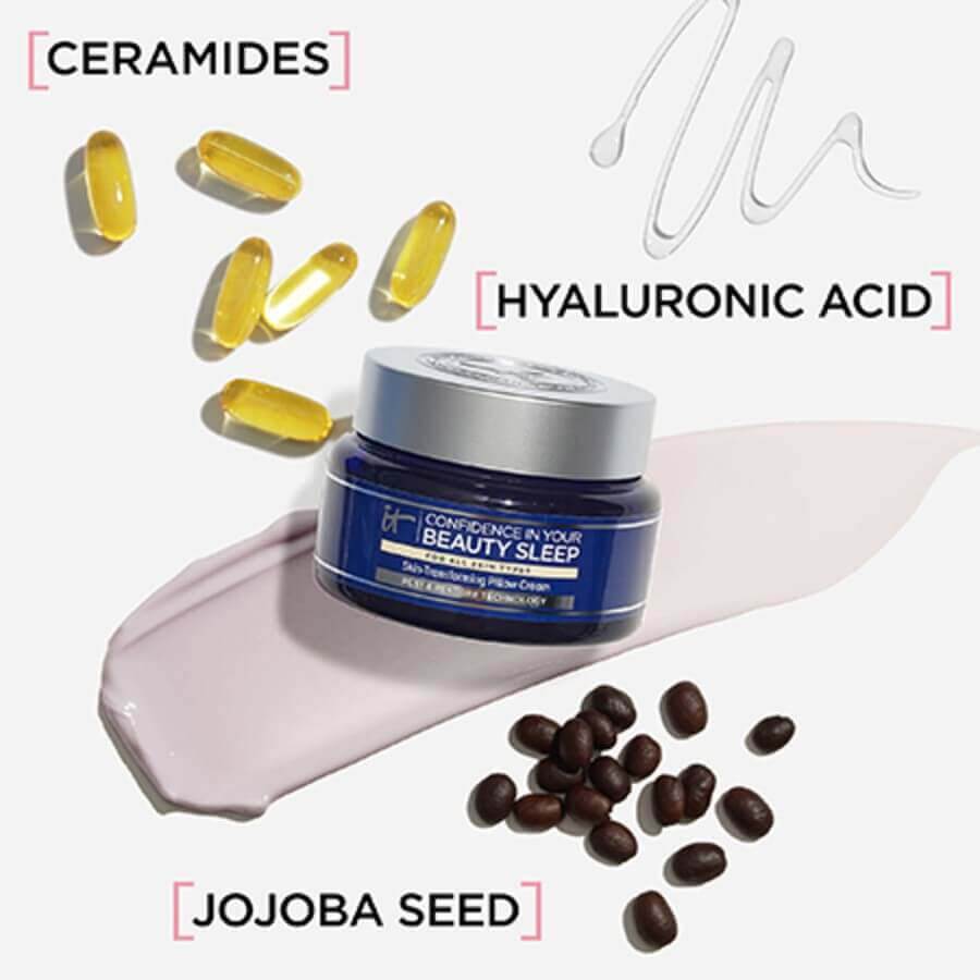 Noćna krema za lice Confidence in Your Beauty Sleep djeluje i hidratizira preko noći kada kada je regeneracija stanica kože najintenzivnija. Zahvaljujući Rest & Restore tehnologiji, vidljivo poboljšava 5 ključnih znakova starenja: fine linije, bore, suhoću, beživotnost i gubitak čvrstoće. Već nakon prve noći, koža će biti hidratizirana, glatka i meka. Nakon samo 7 noći, fine linije će biti manje vidljive, a koža će biti čvršća i punija. Pogodna za sve tipove kože. Obogaćena ceramidima, hijaluronskom kiselinom i umirujućim mirisom lavande, Confidence in Your Beauty Sleep krema savršen je završni korak vaše rutine njege kože!