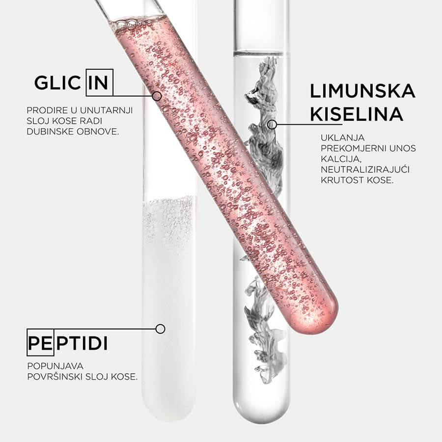Naš prvi predtretman prije pranja kose za dekalcifikaciju i obnavljanje svih tipova oštećene kose. Tvrda voda s kalcijem može dodatno oštetiti već nježnu, osjetljivu ili posvijetljenu kosu. Zbog veće poroznosti, oštećena kosa upija 3x više kalcija nego prirodna kosa. Koncentracija čistih aktivnih sastojaka ovog tretmana ima dvostruku učinkovitost: dekalcificira kosu od nakupina kalcijem* i obnavlja je iznutra prema van, obnavljajući snagu kose i vraćajući joj prirodni izgled.