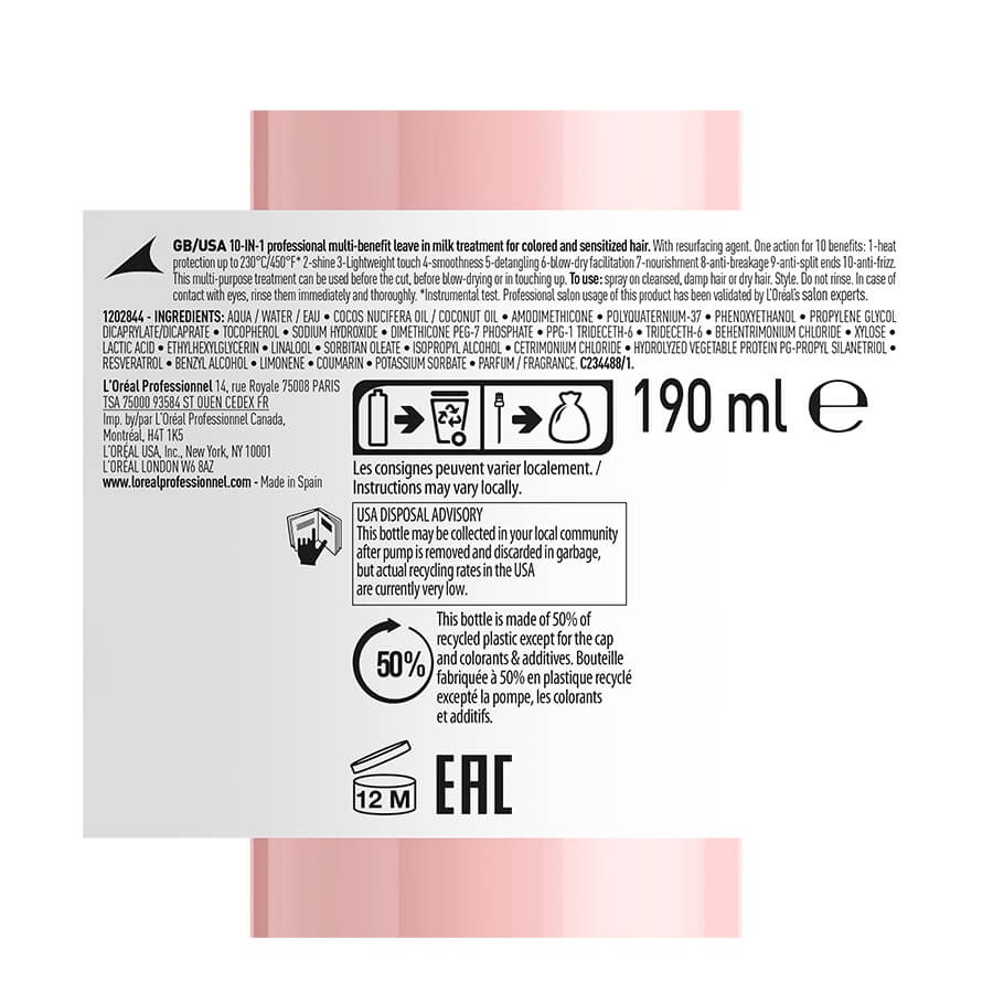 Formula obogaćena antioksidantima, trenutno štiti obojenu kosu. Jedna upotreba za 10 koristi: 1 - zaštita od topline do 230°C*, 2 - sjaj, 3 - mekoća, 4 - glatkoća vlakna, 5 - raspetljavanje, 6 - olakšano feniranje, 7 - hidratacija, 8 - štiti kosu od lomljenja, 9 - protiv ispucalih vrhova, 10 - anti-frizz učinak. Ovaj višenamjenski sprej može se koristiti prije šišanja, feniranja ili za usavršavanje.