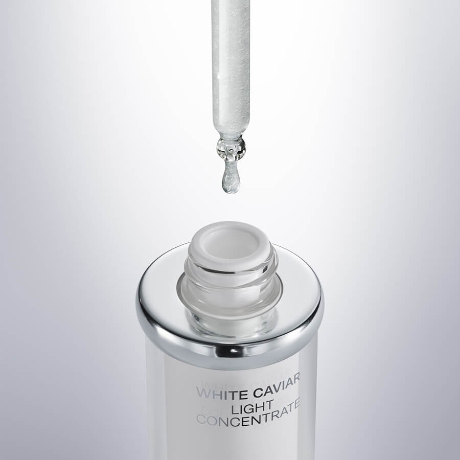 White Caviar Light Concentrate poboljšava teksturu, ton i strukturu kože. 1. TEKSTURA KOŽE La Prairie predstavlja koncentrirani Retexturising Complex [Peptid + 5% Niacinamid + Ekskluzivni Cellular ComplexTM] koji potiče obnovu stanica i poboljšava prirodni proces eksfolijacije kože, čineći je prozirnijom, glađom i blistavijom. 2. TON KOŽE Patentirana LumidoseTM, najsnažnija posvjetljujuća molekula danas, smanjuje tamne mrlje i prema novim otkrićima ciljano djeluje na promjene boje kože nakon akni. Ova molekula je inkapsulirana radi precizne dostave i pojačane učinkovitosti. Ton kože postaje vidljivo ujednačeniji. 3. STRUKTURA KOŽE Mikronutrijenti kavijara, jedinstveni sastojak kavijara, pojačavaju staničnu energiju i potiču proizvodnju kolagena i elastinskih vlakana. Kao rezultat, poboljšava se refleksija svjetlosti unutar kože koja s vremenom postaje blistavija i čvršća.