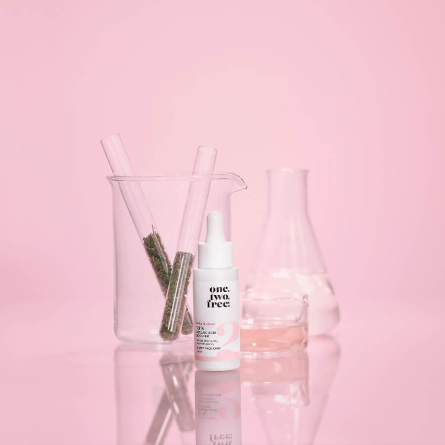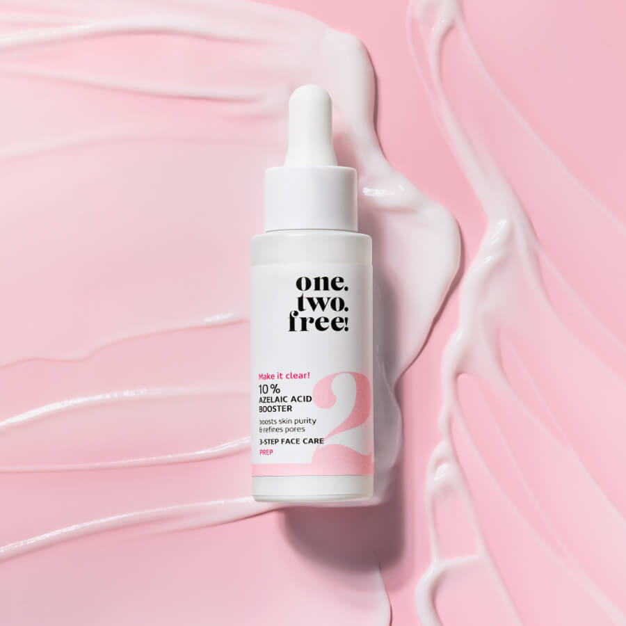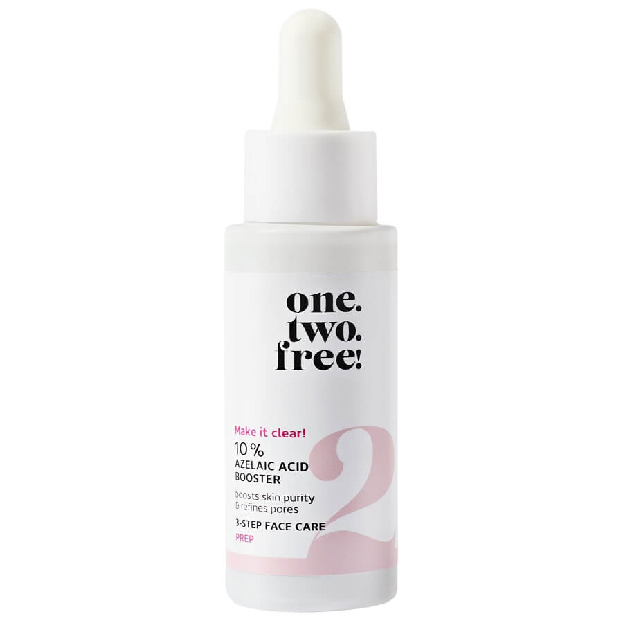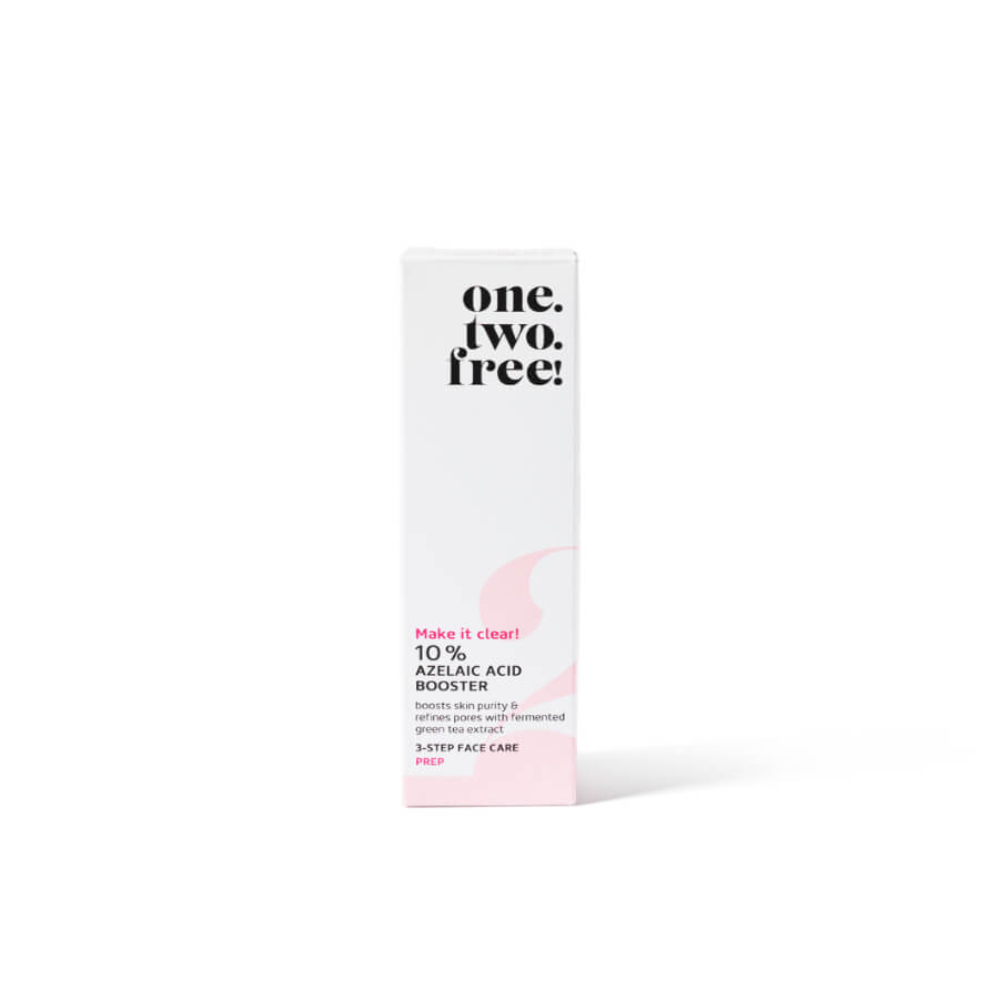 S 10 % Azelaic Acid Booster, one.two.free! predstavlja pročišćavajući hidratantni serum za zaglađenu kožu sa smanjenim porama. Isprobajte jedinstvenu formulu s visokoučinkovitim sastojcima poput azelaične kiseline, koja je poznata po svom djelovanju protiv bakterija koje uzrokuju akne i crvenila te zaglađuje cijelu strukturu kože, natrijevog retinil-hijaluronata, koji uklanja višak masnoće i čini kožu elastičnijom, te fermentiranog ekstrakta zelenog čaja, koji koristi antioksidanse za jačanje vlastitih obrana kože i izjednačavanje tena. Formula je toliko blaga da je mogu koristiti i osobe s osjetljivom kožom.