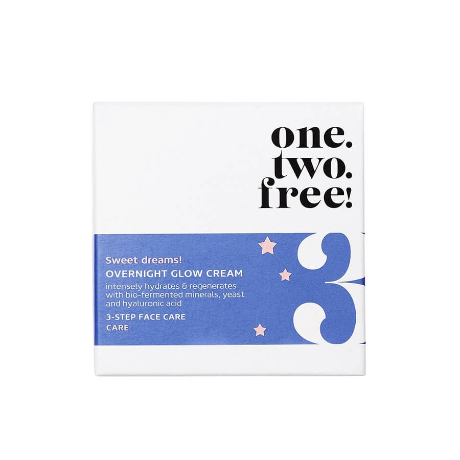Ujednačena i blistava koža tijekom noći. Tijekom vašeg kozmetičkog sna, umirujuća noćna krema za sjaj iz one.two.free! kolekcije intenzivno vlaži sve tipove kože i podupire prirodnu regeneraciju kože. S visokoučinkovitom kombinacijom hijaluronske kiseline i glukomanana iz korijena konjaka, formula obnavlja zalihe vlage u koži, dok bio-fermentirani minerali i fermentirani kvasci potiču proizvodnju vlastitog kolagena u koži i jačaju vlakna kolagena. Eterična ulja dragocjene lavande sadržana u noćnoj kremi također djeluju umirujuće i pomažu zaspati. Rezultat ujutro je savršeno hidratizirana, punija i ujednačena koža sa svježim sjajem.