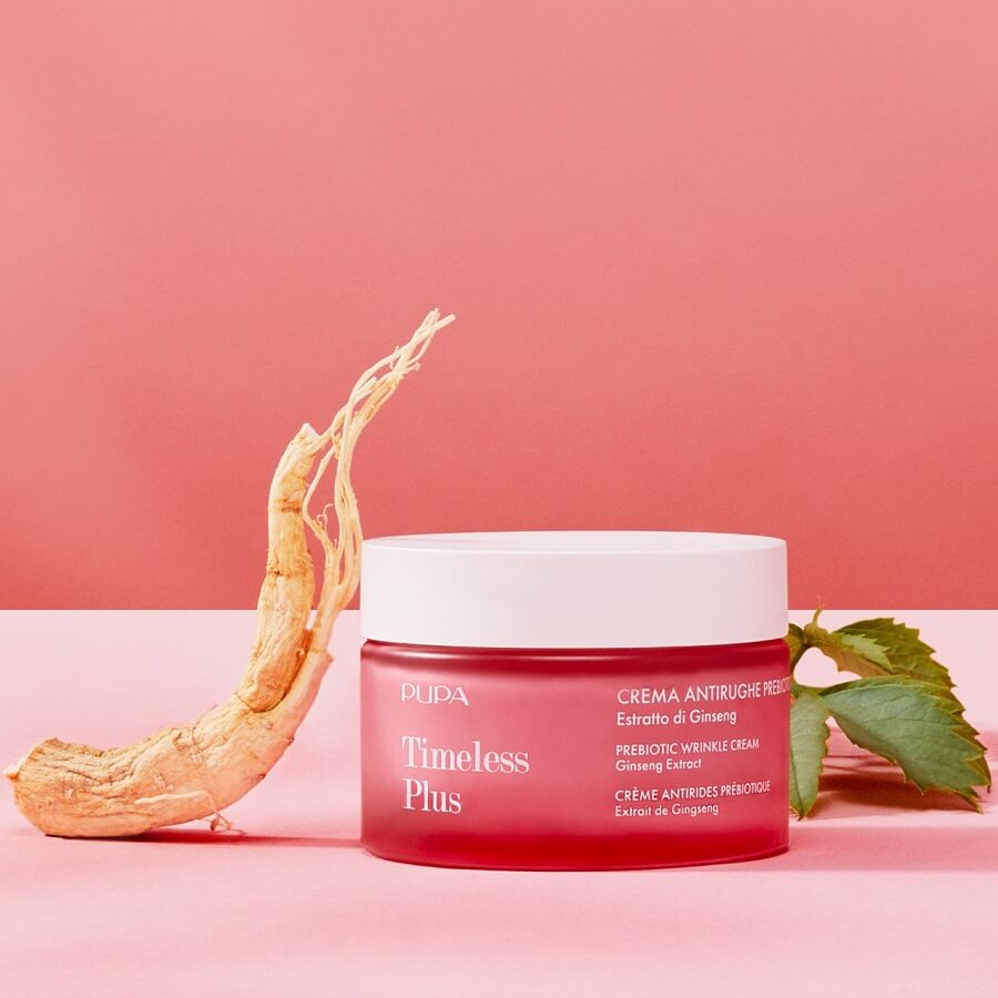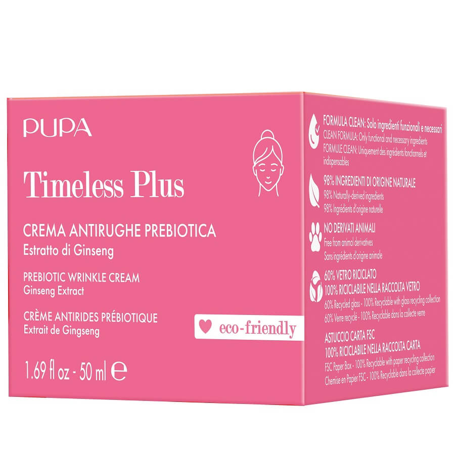 Inovativna clean formula napravljena samo od funkcionalnih elemenata i 98% sastojaka prirodnog podrijetla. Ekstrakt ginsenga je snažan antioksidans koji se suprotstavlja efektu slobodnih radikala, dok botanički ekstrakt Drva života usporava proces starenja kože. Prebiotički aktivni sastojak osigurava ravnotežu mikrobiote kože. Timeless Plus, idealan za zrelu kožu, iz dana u dan vidljivo smanjuje bore, izglađuje znakove starenja te poboljšava čvrstoću i elastičnost.