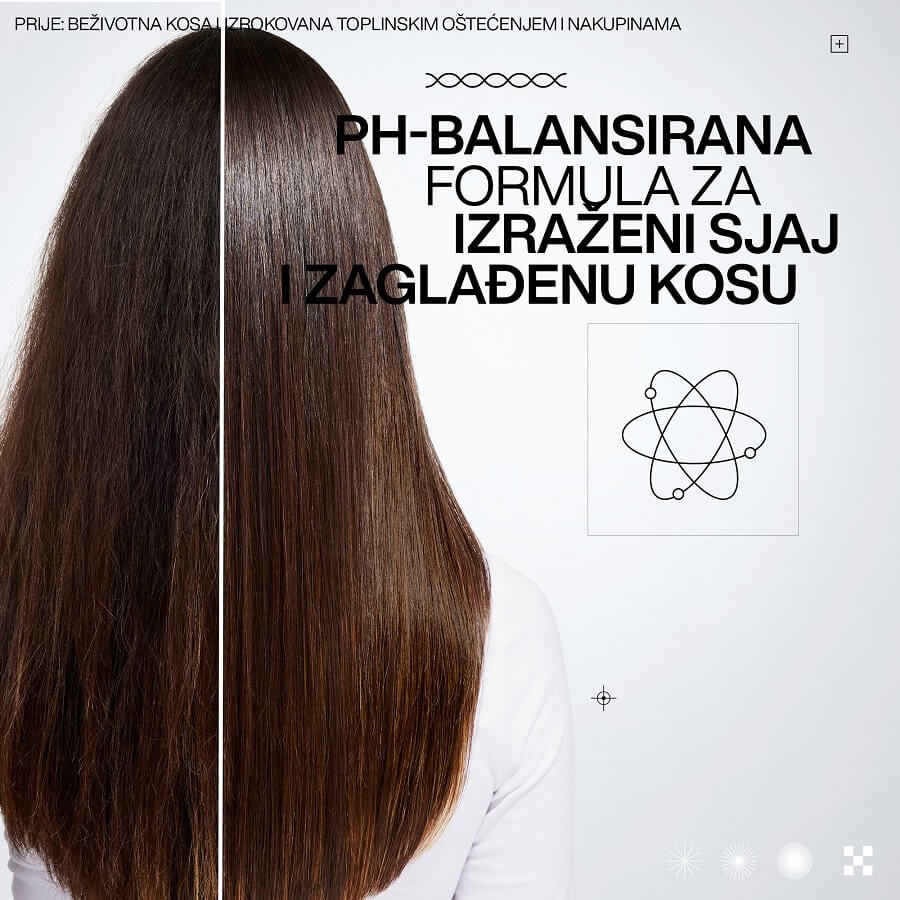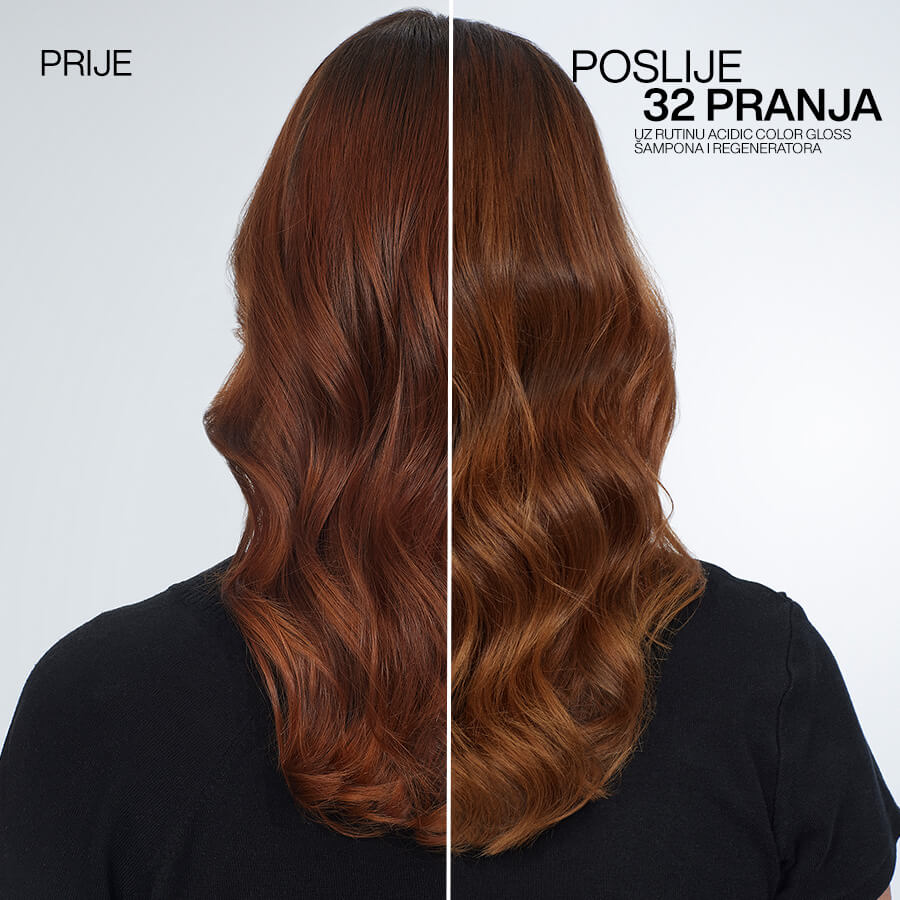 Najnovija inovacija u njezi boje iz Redkena, Redken Acidic Color Gloss regenerator je revolucionarni regenerator za sjaj koji produžuje trajnost boje kao iz salona, njeguje kosu i pruža sjaj kao iz salona. Ova kiselinska formula je pH uravnotežena za dugotrajnost boje do 32 pranja* i povećanje sjaja kose za 76%**. Intenzivno njeguje kosu i zatvara kutikulu kako bi zadržao sjaj na molekularnoj razini. Koristite ga kao kompletan rutinski tretman s Acidic Color Gloss šamponom, Activated Glass Gloss tretmanom i kremom za zaštitu od topline.